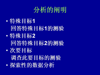 既然所有基础工作已完成,我们必须将注意力转会至目标。我们如何实现目标?哪个统计分析将回答预定的问题?研究的主要分析必须预先确定。所有探索性的数据分析可以以后再做。但是探索性的发现不能在同样的研究中检验。他们是“假设产生的发现”。只有预定的假设可被检验。新产生的假设可以成为更进一步研究的目标。