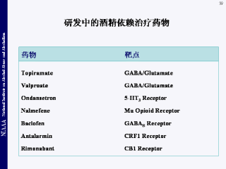 新近问世的药物对众多酒精依赖患者有效。研究指出寻求酒精的行为受多种神经递质系统的影响:神经调节因子、激素以及细胞间信号传递网络。这些都可成为新药物的靶点。潜在的靶点位置包括:神经递质系统(