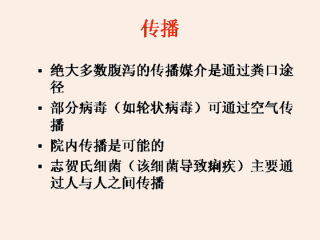 直接或间接污染感染者的粪便或呕吐物的食物或水是传播的主要形式。摄取生的或不熟的海产品、进食海边和江边的贝类可以导致腹泻的爆发。人与人之间的传播通过感染者粪便的媒介经手-口途径传播。轮状病毒可能通过呼吸传播。