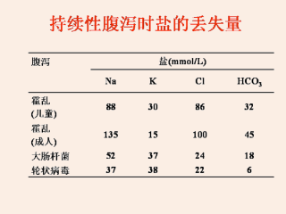 霍乱丢失的盐量和水量比其他形式的腹泻要多(Molla et al. 1981)。然而,轮状病毒性腹泻与其他腹泻相比,丢失的钾较多,丢失的其他盐较少。因此,通常由于轮状病毒性腹泻补液时,应该在服用口服补液盐之间给予额外的清水或母乳,防止高钠血症(盐负荷过重)