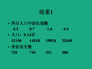 这张片子显示了四分区域中唐氏指数的分布、儿童人口和骨折发病率情况。