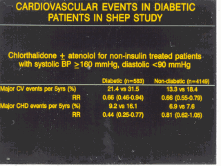 | It is a comparison of diabetic and nondiabetic subjects in the SHEP study. Major coronary heart disease events were reduced in non-diabetic subjects by 19% as a result of blood pressure lowering with chlorthalidone and atenolol. In diabetic patients was 56% reduction in major coronary heart disease events with this level of blood pressure lowering. The benefits of tight blood pressure control are more dramatic that might be expected. |