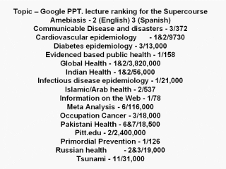| Of the 15 Supercourse topics we examined with page rankings, 14 were in the top 10 in terms of page rankings. What was surprising is that for some, such as Global Health, it was not only with lectures, but it was for all the pages on global health on the web. |