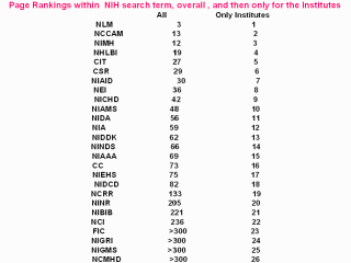 NIH Institutes with ranks (NLM, 17, NIMH, 126, NIEHS, 209, NICHD, 225, NHLBI, 295)