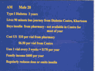 | The problem of Type 1 diabetes and access to insulin is a common one in developing countries. I’ve asked medical students at the medical Schools in London and United Kingdom to record details of patients with Type 1 diabetes and problems they have with a regular availability of insulin. This slide shows a typical example of 20 years old men from Sudan. So, he regularly reduces dose in order to economize. |