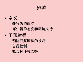 维持期的目标是形成必要的态度以及建立一个可以保障终生执行新行为的环境。为保证他们不再退回原点,有些很棘手的问题是个人必须克服的。就我们了解的,很多新的健康行为不能维持很长时间。个人必须有新的态度、知识和信仰以获得成功。你尝试过改变一项生活习惯么?在你组里讨论讨论你的经历,你采取的方法,它们是否可行。在这个模型里我们讨论了我们的信念系统是多么的牢固,因此,也许个人要花很长时间才能改变他们的信念,比如说对吸烟和酗酒。然而,我们周围成功的例子很多。有很多人在戒烟,有些很快戒掉了,因为这对他们来说突然变得很重要。