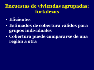 | Las encuestas de viviendas agrupadas son muy eficientes, particularmente en áreas densamente pobladas. Estimaciones de la cobertura son válidas para agrupamientos individuales y el método de estimaciones “30 por 7” cubre +/- 10% de la población verdadera. Cobertura puede compararse entre regiones si los métodos son identicos en todas las regiones (i.e., todas las regiones usando el método “30 por 7”). |
