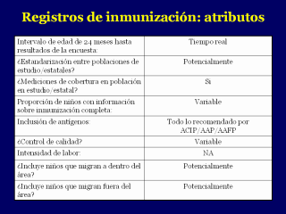 Esta tabla resume los atributos de los registros de inmunización en la medición de la cobertura de inmunización.