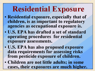 assessing risks from pesticide exposure of children (1999a). The objective of the SOP is to provide standard methods for developing non-dietary residential exposure assessments for both applicators (users) and post-application exposures when chemical- or site-specific field data are limited. The SOP cover calculation algorithms for estimating dermal, inhalation, and/or incidental ingestion doses for a total of 13 major residential exposure scenarios: (a) lawns; (b) garden plants; (c) trees; (d) swimming pools; (e) painting with preservatives; (f) fogging; (g) crack and crevice treatments; (h) pet treatments; (i) detergent; (j) impregnated materials; (k) termiticides; (l) inhalation of residues from indoor treatments; and (m) rodenticides. Children are not little adults. In many cases, their exposures to environmental contaminants can be much higher than those of non-user adult residents. As the above guidance on data requirements puts it, children will crawl, roll, and climb over contaminated surfaces while having a smaller body surface-to-body weight ratio than adults. They eat different foods which may result in higher dietary ingestion. Their hand- and object-to-mouth activities will also result in nondietary ingestion if the hands or objects (e.g., toys) are contaminated. |