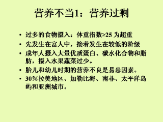 超重是指那些体重指数(BMI)大于25的人,体重指数大于30的人常变得有问题。当营养过剩成为一个社会的问题时,它首先发生在富人中,然后是较低的阶级,甚至是穷人。通常是穷人缺乏高质量的食物,导致超重,最终以更糟糕的营养不良结束。速食产品,汽水(Coke,