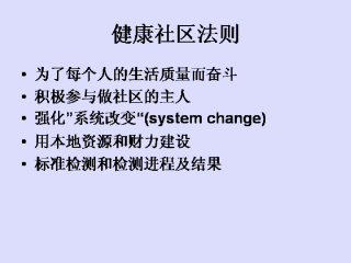 标准检测和检测进程及结果。健康社区通过效能测量和社区指标来促进信息在成员中的流动和公开,同时也可以显示是否在向着目标前进。有时候,正确的信息对长期的社区促进计划有重大意义。