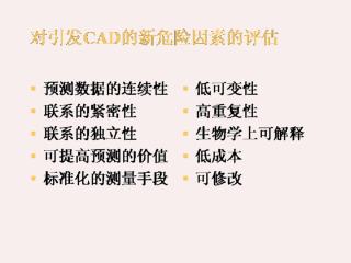 任何能引发疾病的新的危险因素在取得临床应用前必须先满足一系列的准则。这些准则包括预测数据应连续,危险因素与疾病的联系应紧密,在流行病研究中该联系应该是独立的,另外,必须有可变性低及重复性好的标准化测量手段。如果能将此危险因素标志通过某一生物学上的假说与疾病联系起来,那就更好了。最后,检测手段成本应低,并且首先应该是可修改的。以上的许多准则正被用于评估“高敏C反应蛋白”试验。