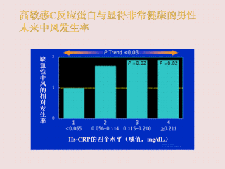 另一个有趣的有关CRP与心血管疾病的发现是,未来血栓性中风的相对发生率也随着炎症水平即hs-CRP水平由低正常水平增加到高正常水平而增加。这些数据非常激动人心,因为脂类水平尤其是低密度脂蛋白胆固醇(LDL-C)水平是非常差的预测中风的因子。从西伐他汀试验中我们知道降低脂量可以降低中风的发生率。我们对研究西伐他汀试验潜在的非脂类机制的兴趣一部分来自这个简单的发现。
