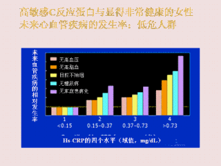 这些数据帮助我们理解为什么某些显得很健康的低危人群却会发生心肌梗塞和中风。一些我们多数人认为是属于心血管疾病的低危人群的中年妇女(她们无高血压、高脂血、不抽烟、无糖尿病、无家庭患动脉粥样硬化症的记录)中,当她们的CRP水平增高(从低正常水平到高正常水平),未来患血管疾病的概率也同样增加。这些数据和我们的假设符合,即粥样硬化斑块稳定性正如炎症反应所显示的那样:即使动脉粥样硬化程度很低,如果人体倾向于使斑块板破裂并由此引发CRP水平上升,那么似乎此时人体最可能产生血管疾病。