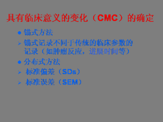 分布方法:我们可以看一个时间点SDs也可以预见观测SDs在HRQoL中长期的变化。SEM:通过参考数据减少因不可靠的测量引起的错差。大量错误掩盖了真实结果。1SEM被认为是为评估CMC提供可行的方案。