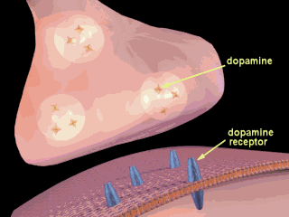 | This slide and the one that follows show how neurotransmission works specifically for dopamine. What is schematically illustrated in this slide is a nerve terminal (top), the synaptic cleft or space between the neurons, and the post-synaptic or receiving portion of a dendrite on a neighboring neuron. Dopamine is contained in vesicles (round storage sites) in the nerve terminal; dopamine receptors are present on the receiving (bottom) neuron. |