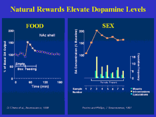 Natural rewards stimulate dopamine neurotransmission. Eating something that you enjoy, for example, or being stimulated sexually, can cause dopamine levels to increase. In these graphs, dopamine is being measured inside the brains of animals. Its increase is shown in response to food or sex cues. This basic mechanism of controlled dopamine release and reuptake has been carefully shaped and calibrated by evolution to reward normal activities critical for our survival.