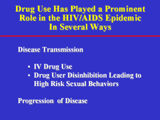 | Drug Abuse and HIV/AIDS are intertwined epidemics in ways that go beyond the sharing of drug injection equipment. While injection drug users are still at great risk, anyone under the influence of drugs or alcohol is also at heightened risk of contracting or transmitting HIV. Drug abuse can also contribute to a more serious HIV disease progression, possibly through direct effects or interactions with HIV on the immune system, and also by adversely impacting adherence to HIV treatment. |