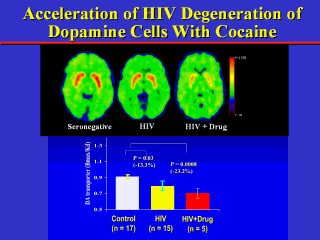 | Evidence shows that drug abuse can worsen HIV symptoms. Positron emission tomography brain scans demonstrate, for example, that cocaine abuse accelerates the deficits in the dopamine system observed with HIV. |