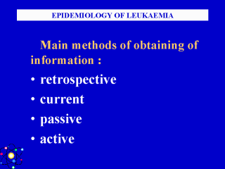 study was carried out by means of search for data of previous years. Current study was based on the annual collection of information on new leukaemia cases. Passive method is a method of obtaining information from medical institutions on special inquiry. Active method is based on scientific expeditions of Institute supervisors to the regions inhabited by exposed people. |