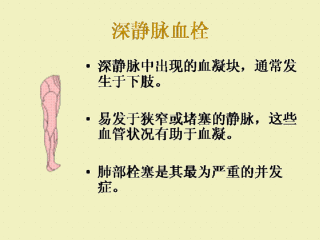 深静脉血栓最为严重的并发症是肺部的血管栓塞,这是由于腿部静脉中的血凝块运行到肺部,并堵塞了动脉。目前许多飞行中的死亡事件都是由肺部栓塞引发的。