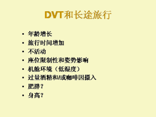 提出的长途飞行中导致深静脉血栓的潜在危险因素,包括长时间的不活动(尤见于长途飞行),脱水,坐椅限制,以及前面提到的导致该病的一般因素。有推断说,基于机舱中的座位设计,个人身高(高于6英尺或5英尺)可能也是致病因素之一。