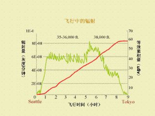 这张幻灯片显示了飞行中出现的程度不同的宇宙辐射。这张图表中注明了由西雅图飞往东京的747-200航班上不同时间段吸收的辐射量。红色实心线(上升)表示了随着航班的进行射线吸收的积累量。