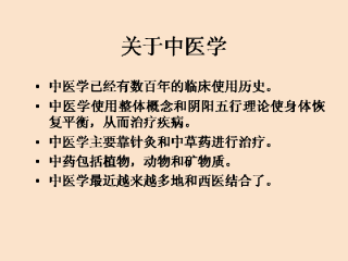 前面说过,中医在中国已经有成百上千年的临床实践的历史了。中医学是建立在具有悠久传统的整体概念、观察经验和具体实验的基础上的。这里用到的所谓整体概念主要是指(但不是仅限于)阴阳理论;生命的动力——“气”;五行(五种自然元素)——金、木、水、火、土。这种阴阳五行整体理论的应用,很难被翻译成其他语言,并且关于这些内容的具体讨论已经超出了本课的范围。对这些有兴趣的人可以自行寻找相关书籍。