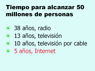 | La velocidad con la cual el Internet se ha convertido de uso amplio es más remarcable. Ha sido aceptado más rápidamente que el teléfono o el radio. |