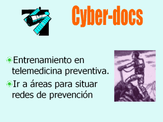 | Estamos desarrollando una disciplina de telemedicina preventiva. Estamos iniciando por entrenar personas en este campo. Los cyberdocs son personas entrenadas en medicina/enfermería/veterinaria/salud pública. Luego entrenados en telecomunicaciones. |