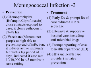 | Prevention - Administer Rifampin (<18 yrs) or Cipro (adults) to close contacts of index case. Drugs clear pathogen among those exposed within 24-48 hrs - Vaccinate individuals in an open/closed community when they are at a higher risk (high risk defined as the occurrence of > 10 cases/100,000 population in an open/closed community within a period of less than 3 months) than the common risk in the community (defined as < 1 case/100,000 pop). The vaccine stimulates immune response in vaccinees within 10 days and thereby prevents spread of infection. The vaccine does not provide immediate protection for close contacts exposed to an index case. Outbreaks based on the indication of 10 cases/100,000 in < 3 months, same setting are rare compared to the occurrence of single cases. - Effective prevention depends on timely reporting of index case. Report to HD within 24 hours when signs and symptoms are suggestive of meningococcal infection. Do not wait for laboratory confirmation. Timely reporting allows HD staff to initiate the identification of close contacts to be prophylaxed. - Prophylaxis is initiated for all close contacts who have been exposed to the index case within a window period of 10 days prior to the treatment of the index case (index case no longer infectious). With timely reporting within 24 hours the window period starts from date of treatment of index case. However, when the occurrence of an index case is known with a delay of several days after the disease has become manifest, the window period to prophylax exposed close contacts becomes very narrow or non-existent. If an index case is reported 10 days or more after onset of signs and symptoms, then there is not point is starting chemoprophylaxis of close contacts, since those exposed and susceptible would have developed disease. |