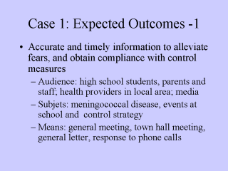 Parents were concerned but calm. Queries about: is the school safe? Can my child get the disease? Why no prophylaxis of students at school? Why suddenly a case of meningitis? How is disease transmitted? Are there other cases?