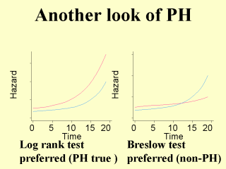 There is a mathematical relation between a survival function and a hazard function (e.g. Fisher & van Belle,1993: Chp. 16). The survival functions in slide 17 give hazard functions that look roughly like those shown in this slide. On the left panel, the two hazard functions have roughly the same patterns. A lower hazard function (blue line) indicates a survival function that is decreasing less sharply. The ratio of hazard given by the blue line divided by that of the red line is approximately 0.6 at any time; hence proportional hazard is true. On the right panel, initially the red line is above the blue line, but they cross over at about time 12. The hazard ratio moves from below one (blue group better) to above one (blue group worse), violating the proportional hazard assumption.