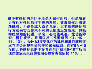 最常见的医学迟发性效应包括内分泌系统并发症,生长激素缺乏,原发性甲减以及原发性的卵巢功能衰竭(10,11,13)。迟发性效应可以进一分成系统相关性的(如损害,衰竭或器官早衰;免疫抑制或免疫系统损害以及内分泌系统损害等),二次肿瘤(如肿瘤复发威胁的增大,原发癌症的伴发肿瘤以及治疗的放射性因素和细胞毒性因素导致的二次肿瘤等)以及功能性改变(如淋巴水肿,括约肌功能紊乱,疼痛综合症,神经病变以及疲乏等);外貌的改变(如截肢,造瘘和皮肤、毛发的变化等);伴随病症(如骨质疏松,关节炎,硬皮病和高血压等)(4,10,11,30)。迟发性和长期并发症的范围从轻微的可治的到严重的致命的(11,13)。