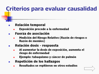 de riesgo ocurre antes del ataque de la enfermedad 2. Credibilidad biológica – algunas veces sabemos, otras no 3. La relación es verificada en estudios repetidos 4. Eliminación de explicaciones alternas: difícil de probar un efecto negativo 5. Cese de efecto: el riesgo cae en ausencia de exposición al factor de riesgo 6. Fuerza de asociación: usualmente medida a través del riesgo relativo.. Entre mayor el riesgo relativo, más probable que sea causal 7. Especificidad de la asociación : exposición específica asociada con sólo una enfermedad – No es aplicable, como se mostró en la discusión previa del esquema de causalidad, 8. Fuerte evidencia relación causal dosis-respuesta |