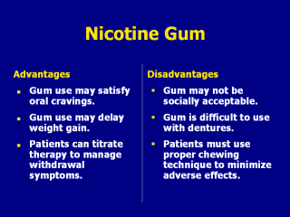 following: Gum use may satisfy oral cravings. Gum use may delay weight gain (Fiore et al., 2000). Patients can titrate therapy to manage withdrawal symptoms. Disadvantages of the gum include the following: Gum chewing may not be socially acceptable. Gum may stick to dental work and dentures. Patients must use proper chewing technique to minimize adverse effects. The gum appears to be particularly helpful with patients who have weight gain concerns or who report boredom as a trigger for smoking. It may also be advantageous for persons who need to more tightly titrate nicotine levels to avoid distraction or irritability withdrawal symptoms in order to avoid injury, such as transportation workers or persons who work with heavy machinery. Fiore MC, Bailey WC, Cohen SJ, et al. Treating Tobacco Use and Dependence. Clinical Practice Guideline. Rockville, MD: U.S. Department of Health and Human Services, Public Health Service, 2000. Slide is used with permission, Rx for Change: Clinician-Assisted Tobacco Cessation. Copyright © 1999-2007 The Regents of the University of California, University of Southern California, and Western University of Health Sciences. All rights reserved. |