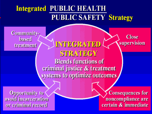 treatment. Public safety approach to sanctioning and punishing drug-abusing individuals involved with crime weakened by relapse to drug use and recidivism – treatment needs not met. |