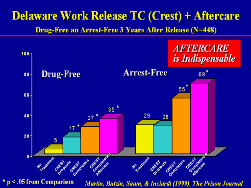 | Treatment works and aftercare is essential Three years after release from prison, still see significant reduction in drug use and criminal activity for individuals who participated in prison-based treatment, community-based residential treatment, and outpatient aftercare. 448 subjects |