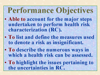 assessment (RA) are TA, human exposure assessment (HEA), and RC. In addition, students should be able to list and define the dozen or more measures that are currently used to denote directly or indirectly a health risk level as (in)significant. They are expected to know that an appreciation or application of any of these risk measures is meaningless, unless they can understand what (minimum) level of safety factor is needed in assessing the health risk in question. By definition, some of the risk measures used today already have a safety factor built in. Last but not least, from this lecture, students should be able to outline and explain many of the major issues pertaining to the uncertainties inherent in RC. It is due to these uncertainties that a safety factor needs to be incorporated into the risk calculation. Students should know that both HEA and TA play an important role in RC, since the latter characterization component is basically an integrative process in which information from HEA is used to check against that from TA. Because the uncertainty issues in HEA and TA are enormous and overwhelming, so are those in RC. |
