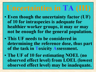 account for the lack of the healthy worker effect (USEPA, 1999b)? Or should this UF be less than 10 when worker exposure is considered? By healthy worker effect, it means the worker group is likely to be healthier and hence less susceptible than the young and elderly in the general population. If the intraspecies sensitivity is truly within an order of magnitude, then why would it be necessary for USEPA (2000d) to strive for a 99.9th percentile exposure for acute dietary intake assessment? After all, such an estimate is less stable than a 95th percentile (see, e.g., Finley and Paustenbach, 1994). And by default, the UF of 10 for intraspecies sensitivity should be considered adequate to protect consumers of all ages and genders. It is also customary for regulatory agencies to divide the LOEL (lowest observed effect level) by an UF of 10 to estimate the NOEL (no observed effect level), when the latter cannot be identified from the toxicity study used. The adequacy of this UF of 10 is likewise questionable. This default assumption asserts that a dose at one-tenth of the experimental LOEL would be low enough to reach the actual NOEL in question. Yet some experimental LOEL could be several times greater than the actual LOEL. And the latter in turn could easily be an order of magnitude or so greater than the actual NOEL. |