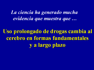 | El abuso prolongado de drogas cambia al cerebro en formas fundamentales que refuerzan la toma de drogas y da lugar a la adicción. Estos cambios son difíciles de revertir y tardan mucho tiempo. |