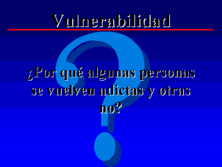 | ¿Qué factores sugieren vulnerabilidad al abuso de drogas y adicción? Vulnerabilidad es un producto de la interacción de los genes de una persona, ambiente y edad de desarrollo. Estas interacciones son complejas y difíciles de separar. |