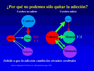 | Adicción cambia los circuitos del cerebro, haciendo difícil “aplicar los frenos” para conductas detrimentes. En el cerebro no adicto, los mecanismos de control constantemente evalúan el valor del estímulo y lo apropiado de la respuesta planeada, aplicando control inhibidor cuando es necesario. En el cerebro adicto, este circuito de control se daña debido al abuso de drogas, perdiendo mucho de su poder inhibidor sobre los circuitos que manejan la respuesta al estímulo. |