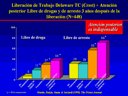posterior es esencial. Tres años después de la liberación de la prisión, vemos reducción significativa en uso de drogas y actividad criminal de individuos quienes participaron en tratamiento en la prisión, tratamiento residencial o atención posterior ambulatoria. 48 sujetos |