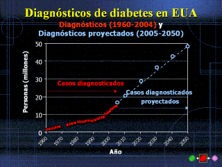 renal. El incremento en casos diagnosticados entre 2000-2004 puede reflejar un aumento en los casos en general posiblemente debido a sub-representación de hispánicos en grupos de datos previos, o puede reflejar mejoría en el diagnóstico en individuos previamente no diagnosticados. Predicciones de casos futuros de diabetes diagnosticada muestran un cuadro ensombrecedor. El Centro de Control y Prevención de Enfermedades, proyecta que para el 2050, casi 50 millones de americanos estarán diagnosticados con diabetes. Fuente: Data for 1960-2004 from the National Health Interview Survey, NCHS, CDC. Projected data for 2005-2050 from Narayan KMV, et al, Diabetes Care 29:2114-2116, 2006. |