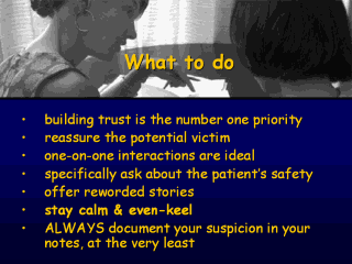 “3. Get the trafficker to leave the room under the guise of a private medical exam (which every pt. has a right to anyway). Or take their attention away from the pt. (ask them to reach for something and mouth to the patient (w/no sound), or subtle card slipping/find some medical reason to give your phone number (be careful, as the pts possession of a card w/o the knowledge of the trafficker at the time of receipt, endangers the pt’s life).