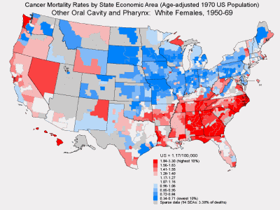 | We were also struck by the patterns for cancer of the oral cavity and pharynx among women which showed clusters of elevated mortality in rural southern areas. In a case-control study in North Carolina, we found substantially elevated risks that were associated with the long-standing practice of snuff dipping, rising to 50-fold for tumors of the gum and buccal mucosa, which are the tissues in direct contact with the smokeless tobacco. |
