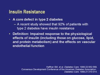 Insulin resistance is a primary defect in type 2 diabetes. As reported in a recent study by Haffner and colleagues, 92% of patients with type 2 diabetes have insulin resistance. It can be defined as an impaired response to the physiological effects of insulin, including those on glucose, lipid, and protein metabolism, and the effects on vascular endothelial function.