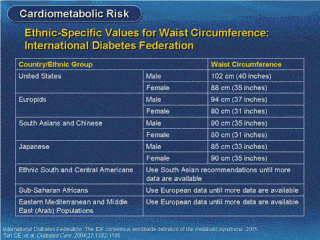 According to the International Diabetes Foundation (IDF) definition of the metabolic syndrome, central obesity (defined by waist circumference) is an essential component for diagnosis of the syndrome. The IDF definition recognizes ethnic-specific values for waist circumference, as shown on this slide. The IDF consensus group acknowledged that these are pragmatic cut-points taken from various different data sources, and that better data will be needed to link these to risk.