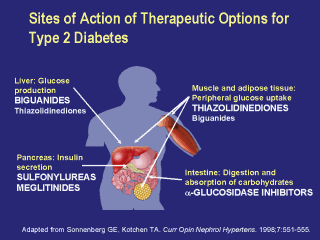 during the absorptive or postabsorptive process. Sulfonylureas, the oldest oral agents used to treat type 2 diabetes, stimulate pancreatic insulin secretion. More recently, repaglinide, a meglitinide, has been added to the available agents that stimulate increased pancreatic insulin secretion. Insulin administration, the oldest pharmacologic therapy for diabetes, is also a choice to increase circulating insulin levels in response to failing beta-cell function and increased insulin resistance. Biguanides increase the sensitivity of the liver to circulating insulin, thereby reducing the level of glucose produced by the liver in type 2 diabetes. Thiazolidinediones, peroxisome proliferator-activated receptors, act at a number of sites to lower blood glucose levels. They also improve insulin sensitivity at the level of the liver, thereby decreasing the excess glucose production by that organ. They are more commonly recognized for their action in increasing peripheral insulin sensitivity in muscle and adipose tissue. By improving this sensitivity, they allow for improvement in the utilization of glucose by the muscle and adipose tissue. It should be noted that biguanides, in high doses, also have some mild effect on increasing peripheral glucose utilization. Alpha-glucosidase inhibitors decrease the rapid influx of carbohydrate from ingested food and slow the digestion of starches and the absorption of glucose and several other sugars. Sonnenberg GE, Kotchen TA. Curr Opin Nephrol Hypertens. 1998;7:551-555. |